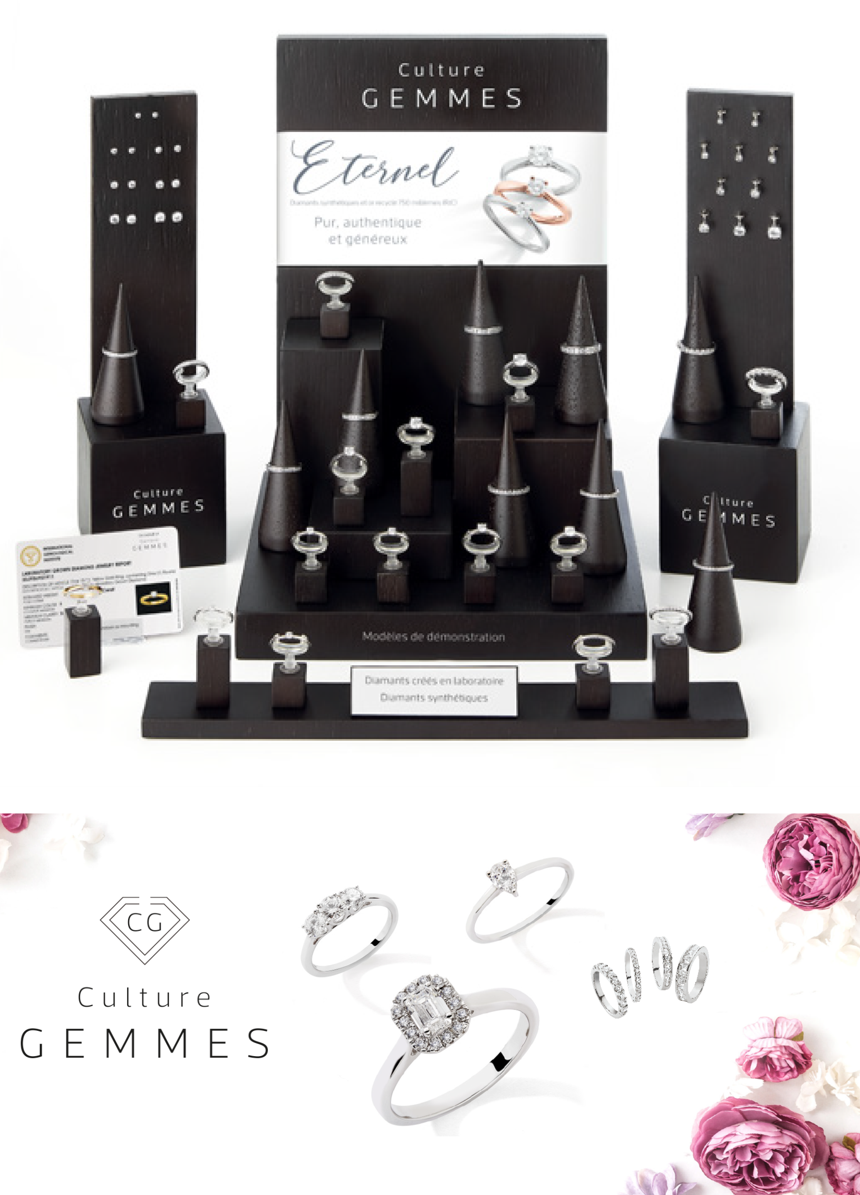 Depuis 2019, Culture Gemmes vous propose des collections avec des pierres précieuses de culture, créées en laboratoire (dites synthétiques). Ses collections, Éternel (des diamants montés sur or 750 ‰) et Serena (diamants et pierres de couleur montés sur or 375 ‰), résolument tournées vers l’avenir, répondent aux besoins d’une clientèle plus attentive, soucieuse de traçabilité et d’éthique dans l’acte d’achat.